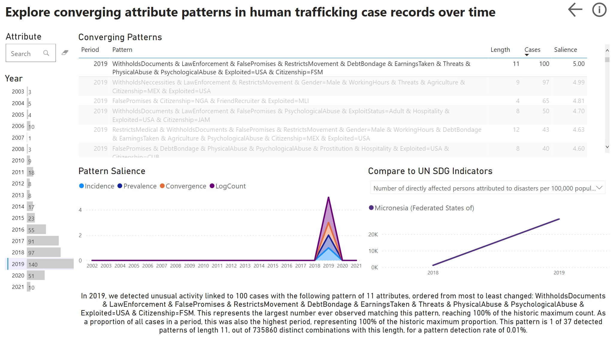 To date, we have informally observed that combinations of converging attributes typically coincide with the maximum absolute or relative frequency of the detected attribute combination over all time—something that would immediately be understood as an “insight.” Due to the graph method used to generate it, these insights are both structurally and statistically meaningful. However, understanding whether this represents a meaningful change in the real world demands domain knowledge beyond the data. This is why, as with Synthetic Data Showcase (opens in new tab), we use Power BI to create visual interfaces for interactively exploring and explaining sets of candidate insights in the context of other real-world data sources, like UN SDG indicators (opens in new tab) on established causes of human trafficking.