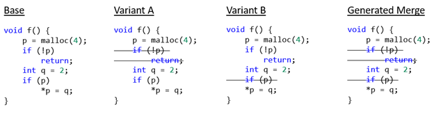 The below example illustrates the complexities of dealing with program semantics. The base program has redundant code, a duplicate test for null on the return value of an allocation function malloc. Removal of the test from either of the two locations in which it exists—as performed by Variant A and Variant B, respectively—leads to faster performance. However, the removal of both the checks exposes a null-dereference bug; interestingly, the default merge algorithm in Git creates such a program as a result of the merge! Such a regression may not always be caught by a test since the call to malloc may return a null value only when subjected to an extreme stress test.