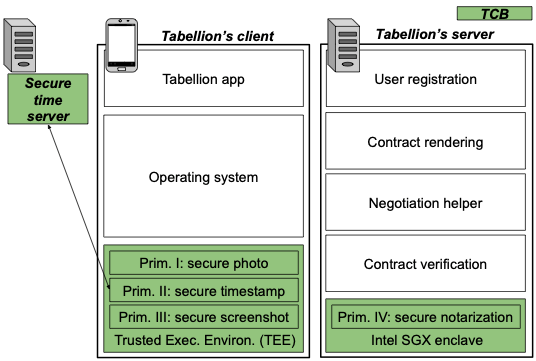 High level software architecture of Tabellion. The Tabellion client on mobile devices includes large amounts of untrusted code, which includes the user-facing Tabellion app and the mobile operating system, along with small amounts of trusted code that run Primitives I, II, III on the mobile TEE. On the Tabellion server, Primitive IV runs on the server TEE which is Intel SGX in our implementation. We also rely on an external secure time server for Primitive II.