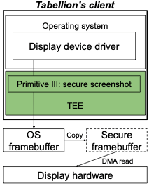 Overview of how Primitive III works in Tabellion. Rather than include the entire display software stack in our TCB, our key idea in Tabellion is to secure the buffer used for displaying content (that is the framebuffer) in the TEE. When invoked by the Tabellion app, the TEE freezes the framebuffer, not allowing any more updates. It then waits for the user’s authentication using biometrics. Once the user confirms, the TEE signs a copy of the framebuffer and unfreezes it. This guarantees that the displayed content and the authentication are atomic.