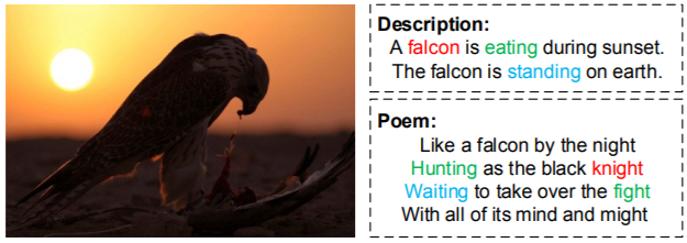 The difference between a human-written description and poem, based on the same image. Instead of describing the image factually, a poem tends to perceive a deeper meaning and poetic symbols from objects – knight from falcon, hunting and fight versus eating, and so on.