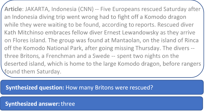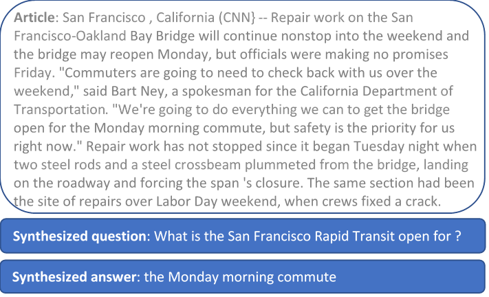 The idea of generating synthetic data to augment insufficient training data has been explored before. For example, for the target task of translation, Rico Sennrich and colleagues present a method in their paper (opens in new tab) to generate synthetic translations given real sentences to refine an existing machine translation system. However, unlike machine translation, for tasks like MRC, we need to synthesize both questions and answers for an article. Moreover, while the question is a syntactically fluent natural language sentence, the answer is mostly a salient semantic concept in the paragraph, such as a named entity, an action, or a number. Since the answer has a different linguistic structure than the question, it may be more appropriate to view answers and questions as two different types of data.