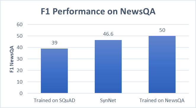 SynNet, trained on SQuAD (Wikipedia articles), performs almost as well on the NewsQA domain (news articles), as a system fully trained on NewsQA.