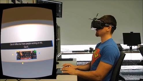Among most users, a traditional keyboard and large, high-resolution monitor are still the preferred input method for editing long documents, working on spreadsheets, and internet browsing. Yet, many users do not touch-type, and so must constantly shift their gaze from the display to their hands on the keyboard and back again. This method of working creates unique challenges in the virtual office environment, where users can see neither their physical hands nor the traditional or touch-screen keyboard on the desk in front of them.