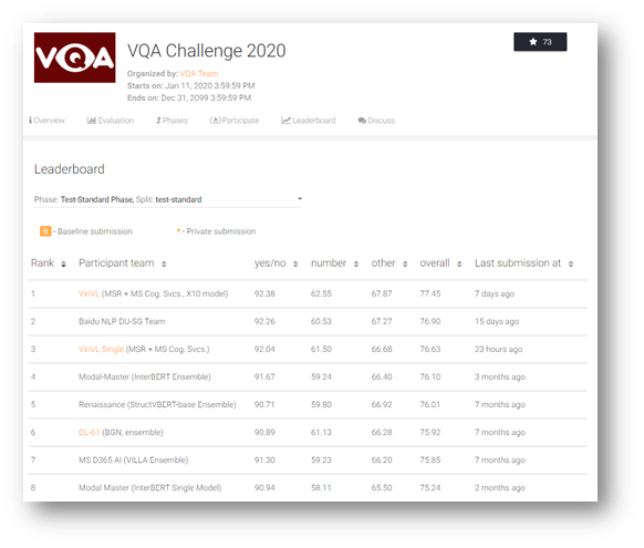 Our new VL models, which consist of the new object-attribute detection model as its image encoding module and OSCAR as its VL fusion module, sit comfortably atop several AI benchmarks as of December 31, 2020, including Visual Question Answering (VQA) (opens in new tab), Microsoft COCO Image Captioning (opens in new tab), and Novel Object Captioning (nocaps) (opens in new tab). Most notably, our VL model performance on nocaps substantially surpasses human performance in terms of CIDEr (92.5 vs. 85.3). On the GQA benchmark (opens in new tab), our model is also the first VL model that outperforms NSM, which contains some sophisticated reasoning components deliberately designed for that specific task.