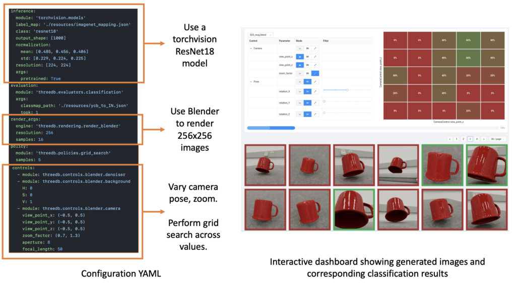 Once the user has specified a set of controls of interest, the system performs a guided search, evaluation, and aggregation derived from these transformations. 3DB achieves this by instantiating and rendering a myriad of object configurations according to the transformations, records the behavior of the model on each rendered scene, and finally presents the user with an interactive, user-friendly summary of the model’s performance and vulnerabilities. 3DB is general enough to enable users to, with little-to-no effort, re-discover insights from prior work on robustness to pose, background, and texture, among others. Users can even compose these transformations to understand their interplay, while still being able to disentangle their individual effects, or easily write their own if required. An overview of the workflow of 3DB is shown in Fig. 2.