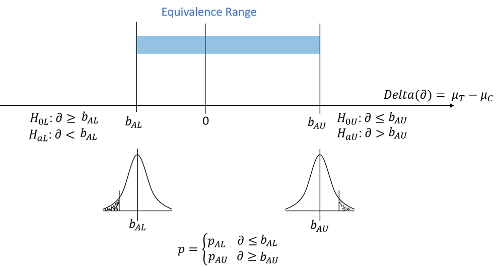 \begin{equation}H_{0 L}: \mu_{T}-\mu_{C} \geq b_{A L} \quad \text { and } \quad H_{0 U}: \mu_{T}-\mu_{C} \leq b_{A U}\end{equation}