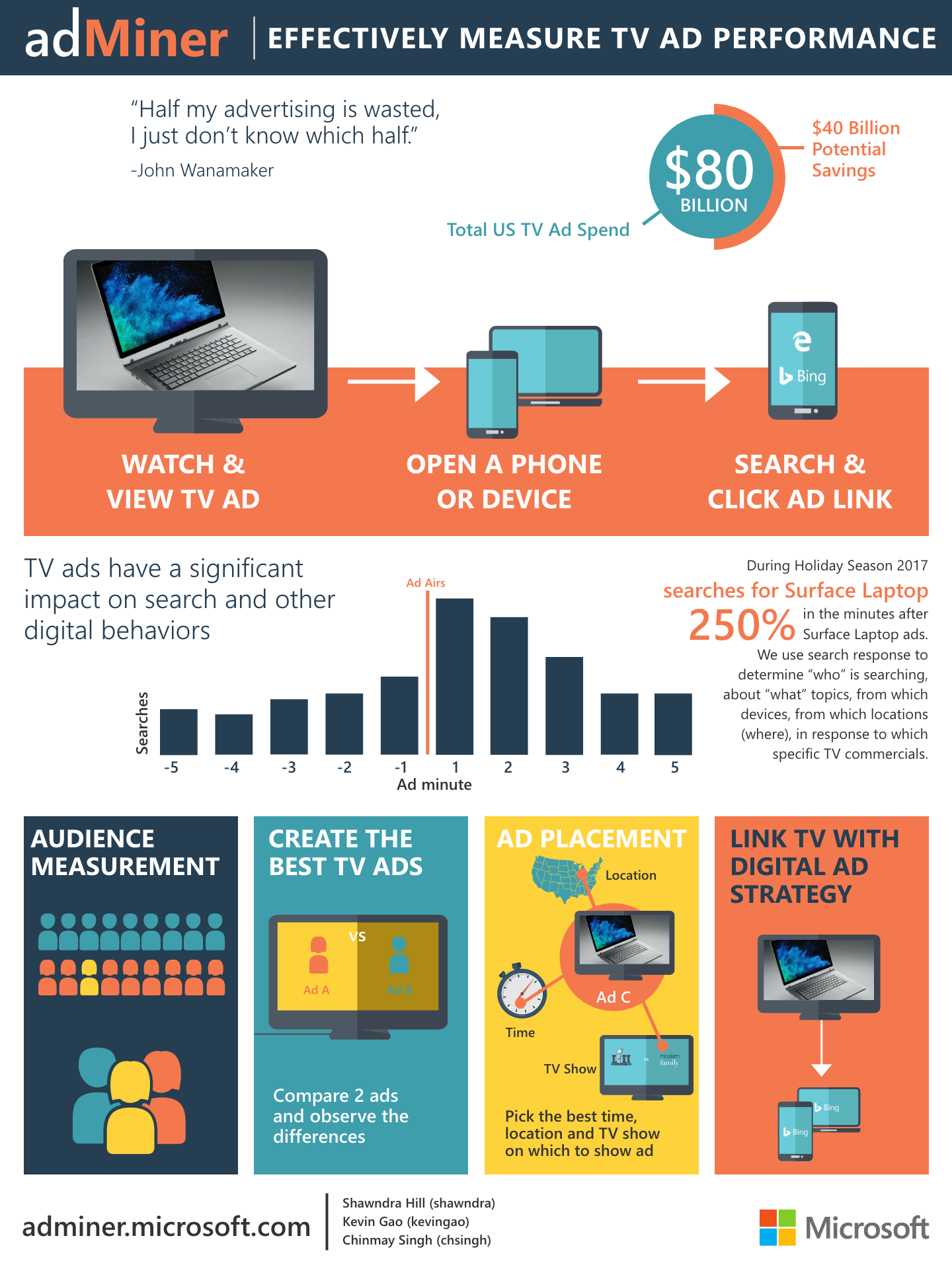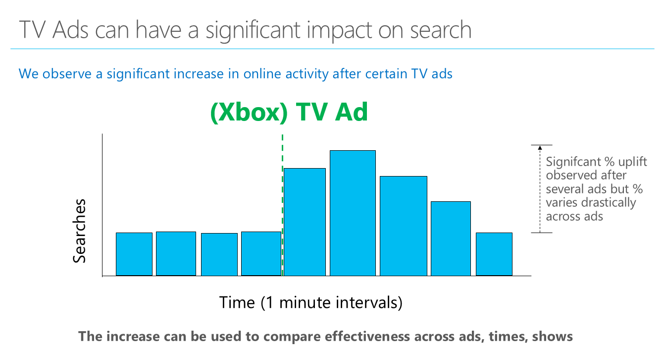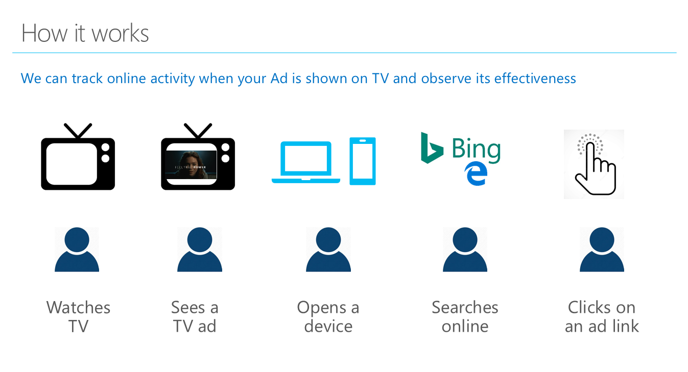Tools to measure and improve effectiveness of cross-channel advertising , by enabling advertisers to better coordinate their marketing efforts across TV, digital and search. Predictive models of consumer behavior based on cross-company data capturing user habits from search (Bing/Cortana), browsing (Edge), TV viewing (Xbox), and purchasing (Universal Store).