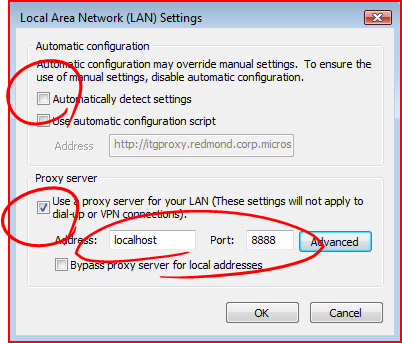 - Check “Use proxy server for your LAN” and ensure that the address is set to localhost and the port is set to 8888.