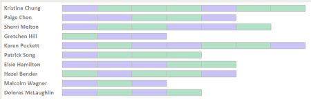 This view shows a graphical summary of each student’s search history. This allows the teacher to quickly assess students’ progress and to see which students might be stuck, or which students might be “spinning” trying to find good queries. Here purple boxes represent queries, and green boxes represent results clicked and subsequent pages visited.