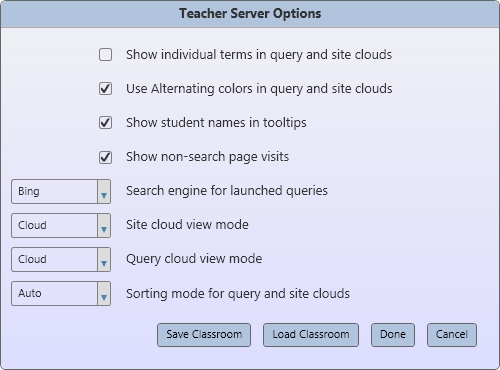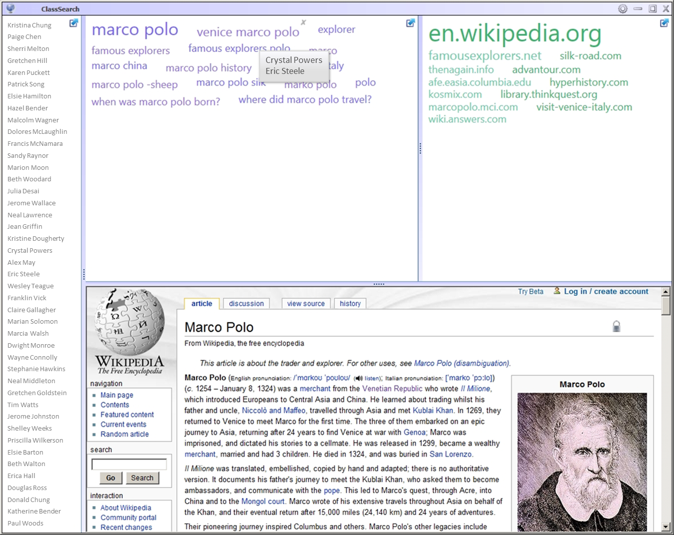 The teacher’s computer offers several views which are intended to be shown on a projected display, available to the entire class. Student names are only associated with content by mouseover, or can be disabled entirely. The components of this view are a list of students logged in to the server (left), a “query cloud” showing queries executed by the class (top center), a “site cloud” showing sites visited by the class (top right), and a Web browser. Clicking any site or query opens the corresponding page in the browser, suitable for discussions like “was this a good query?” or “did this site contain the answer we’re looking for?”