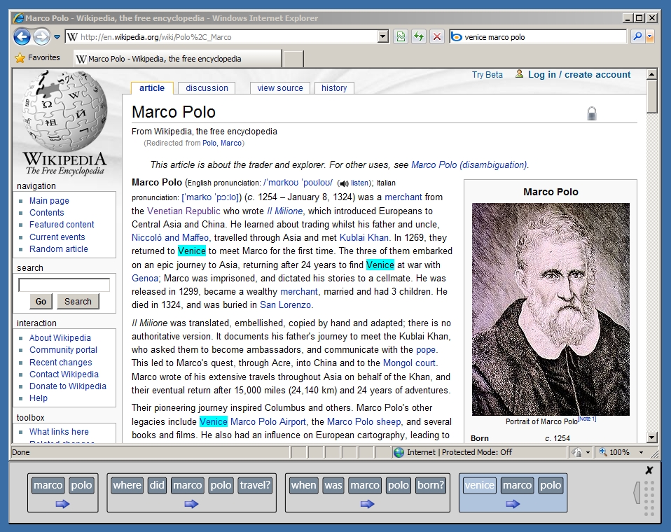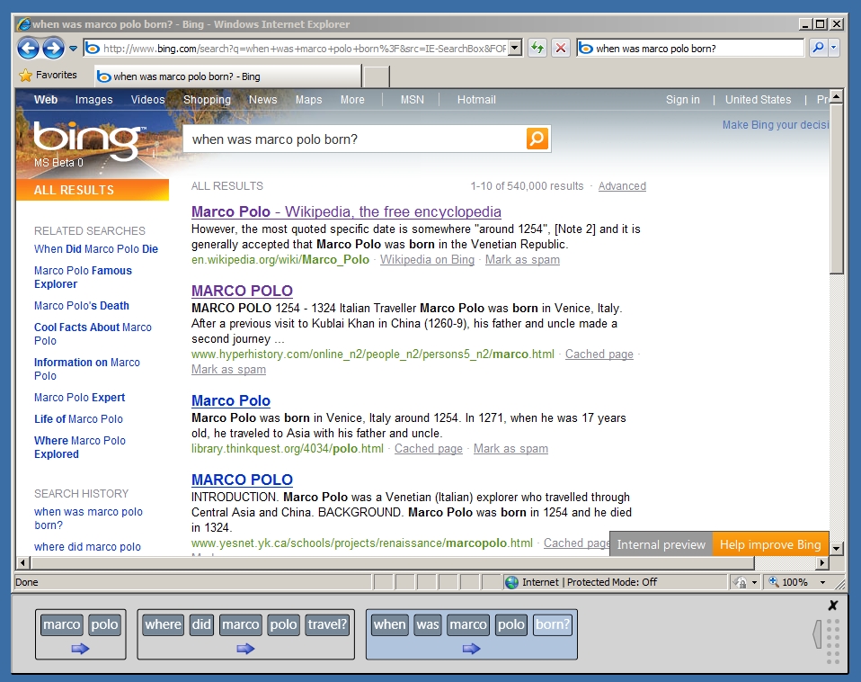 The student’s main view is Internet Explorer, instrumented with a plugin that monitors URLs and looks for searches. Searches are aggregated across tabs and windows, and displayed in a toolbar that attaches to the browser (the toolbar is at the bottom of the screen in this screenshot). The toolbar shows a history of the student’s queries, which both allows the student to assess progress and allows a teacher to quickly glance over students’ shoulders to assess their status as he/she walks around the classroom.