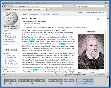 Clicking a term in the student client highlights that term in the browser, helping students connect their search queries to the pages they visit. The important point here is that our client is a logical place to add features targeted specifically at search education. The toolbar window is also used for logging in and out of the teacher’s server, and might be used for classroom tasks in the future: e.g., answering questions, rating pages, etc.