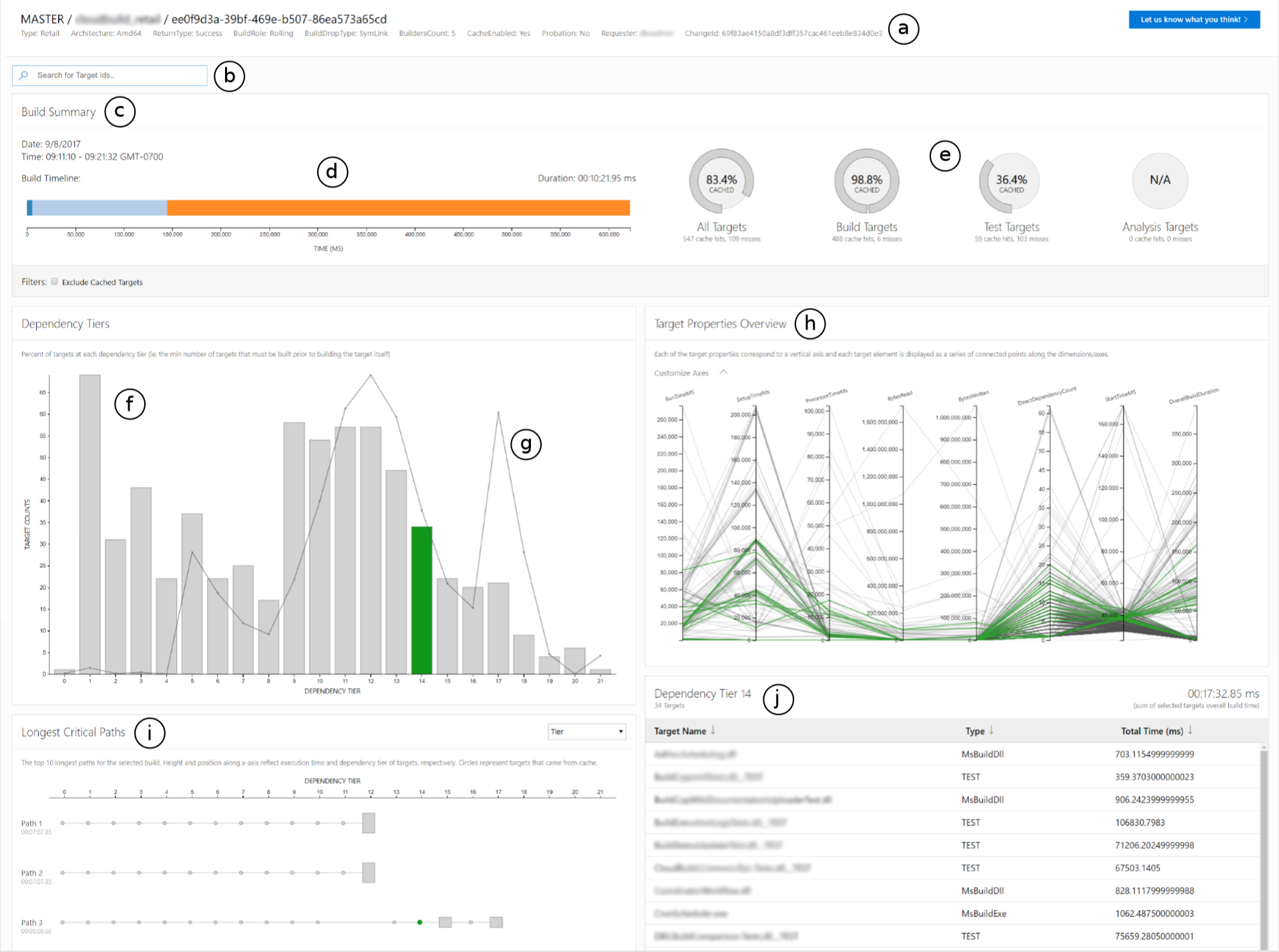 Overview of the CloudBuild Graph Explorer tool featuring: (a) Build Header View, (b) Search Bar, (c) Build Summary View, (d) Build Time-Line Visualization, (e) Targets Cache Visualization, (f) Dependency Tiers Visualization, (g) Tier Time-Line Visualization, (h) Target Properties Visualization, (i) Longest Critical Paths View, and (j) Target List View.