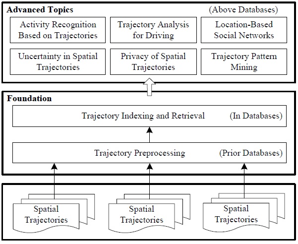 We chose 17 active researchers in the field of computing with spatial trajectories to contribute chapters to this book in their areas of expertise. These chapters are organized according to the paradigm of “trajectory preprocessing (prior databases)–> trajectory indexing and retrieval (in databases) –> advanced topics (above databases),” as illustrated in the following Figure.