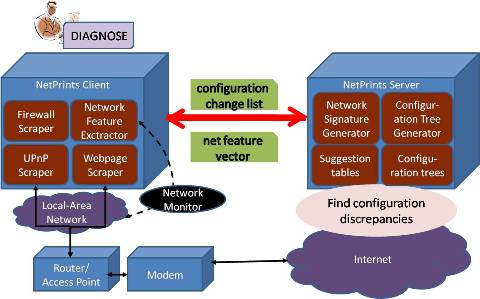 The objective of the NetPrints project is to alleviate home user frustration by making the search for the correct configuration parameters automatic. The main idea of the project is to use shared knowledge to resolve misconfiguration issues in home networks. Say user A and user B run the same application and, while it works well for user A, it doesn’t for user B. But say that user A had had the same problem as user B in the past and had figured out a fix to the problem. User B should then have access to the fix. Also, if the application has always worked perfectly for user A, a comparison of A and B’s home network configurations can yield a solution to user B’s problems.