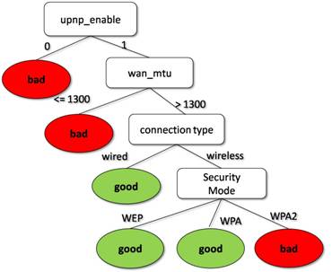 The server gathers such anecdotes from clients and constructs a decision tree (using a machine learning algorithm) for every application to represent the knowledge of good and bad configurations. The figure above shows an example decision tree that we obtained specific to the Xbox 360 using three home routers. The tree informs us that whenever UPNP is disabled on the router, or when the WAN MTU parameter is set lower than 1300, or when the wireless authentication protocol is set to WPA2, the configuration of the home network is “bad”. In other words, the Xbox console will not be able to connect to the Xbox Live service.