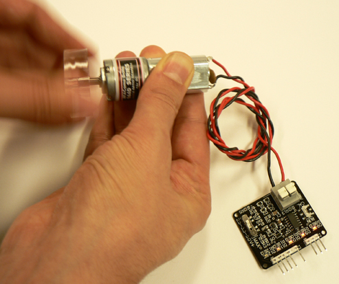 Attach the terminals of a geared DC motor to the grey connector. Use the white switch to select the maximum operating voltage for your target circuit (2.5, 3.3 or 5.0 Volts), and connect the PPB to your target circuit using the header pins. The pins labelled V+ and GND provide a regulated power supply, and pins Speed and Direction can be connected to analog inputs on a microcontroller.