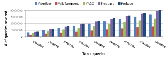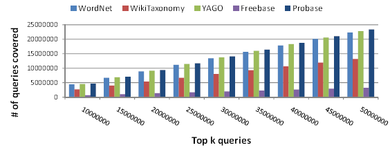 We next measure the taxonomy coverage of queries by Probase, which is akin to the recall measure in IR. A query is said to be covered by a taxonomy if the query contains at least one concept or instance within the taxonomy. Figure 2 compares the coverage of queries by Probase taxonomy against the other four aforementioned taxonomies. Probase outperforms all the other taxonomies on the coverage of top 10 million to top 50 million queries. In all, Probase covers 40,517,506 (or, 81.04%) of the top 50 million queries.