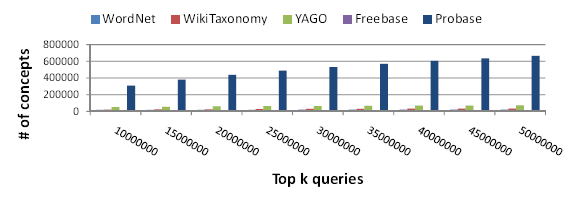 Given that Probase has many more concepts than any other taxonomies, a reasonable question to ask is how many of these concepts are relevant. This question is akin to the precision measure in information retrieval (IR). Here for the purpose of comparison, we define a concept to be relevant, if it appears at least once in web queries. We analyzed Bing (opens in new tab)´s query log from a two-year period, sorted the queries in decreasing order of their frequency (i.e., the number of times they are issued through Bing), and computed the number of relevant concepts in Probase and 4 other general-purposed open-domain taxonomies WordNet (opens in new tab), WikiTaxonomy (opens in new tab), YAGO (opens in new tab), and Freebase (opens in new tab), with respect to the top 50 million queries. Figure 1 shows the result.