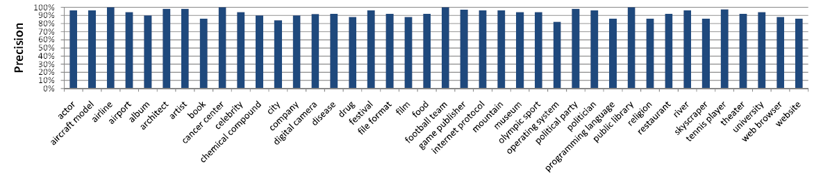 To estimate the correctness of the isA pairs within Probase, we create a benchmark (opens in new tab) dataset containing 40 concepts in various domains. The concept size varies from 21 instances (for aircraft model) to 85,391 (for company), with a median of 917. Benchmarks with similar number of concepts and domain coverage have also been reported in previous information extraction research. For each concept, we randomly pick up to 50 instances/subconcepts and ask human judge to evaluate their correctness and hence also the precision of the extraction algorithm. Figure 6 shows the result. The average precision of all pairs in benchmark is 92.8%, which outperforms precision frameworks like KnowItAll (64% on average), NELL (74%) and TextRunner (80% on average). It is not fair to directly compare our results with Wikipedia-based frameworks like WikiTaxonomy (86% precision) and YAGO (95% precision), whose data sources are much cleaner. Nevertheless, only YAGO has a better overall precision than Probase.