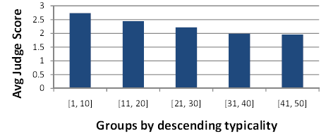 We divide the 50 instances of each concept into 5 groups by their typicality score ranks (i.e. top 10 instances from each concept go to Group 1, second 10 instances from each concept go to Group 2, and so on), and then compute the average judge scores assigned to instances within each group. Figure 8 shows that the typicality of the instances in their classes, as perceived by human judges, decreases with computed typicality scores, which means our definition of the typicality score is sensible.
