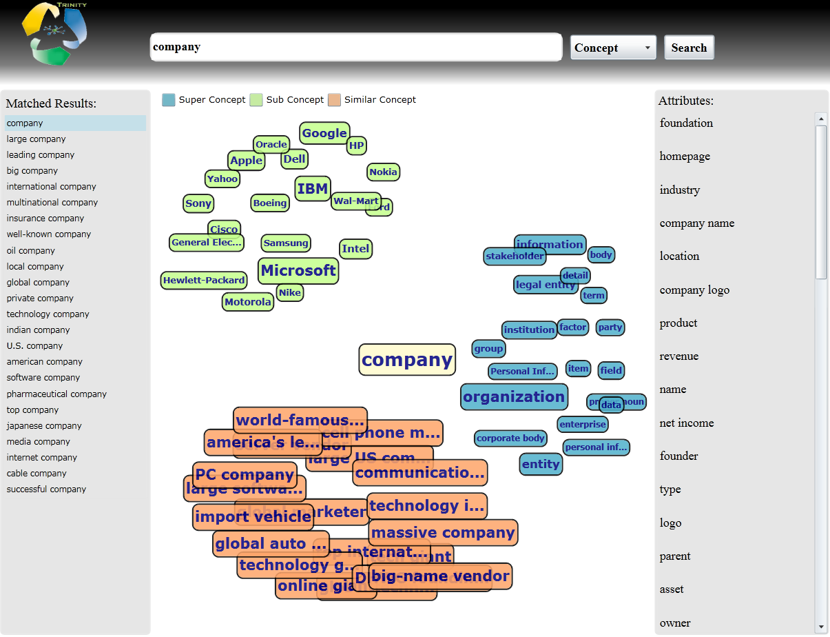Probase Viewer shows the backbone of our taxonomy, such as class-subclass, class-instance and class-attribute. It also shows the results of incorporating external knowledge bases, such as freebase.