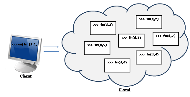 When you tell the package to run your work function in the cloud, it uses a single “data” value common to all of the various instances, and a list of parameter values, which are distributed among them. Here is an example showing how to use the package to distribute a very simple work function over a list of parameter values: