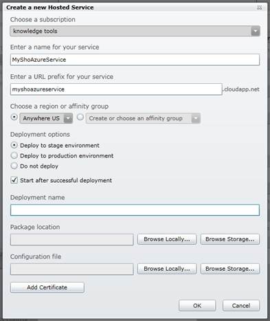 In addition, you can upload the deployment package (and its corresponding configuration file that you edited above) now. Choose “Browse Locally…” and point the file dialog at the .cspkg and .cscfg files in the Publish directory inside you Azure package directory (i.e., SHODIR/packages//azurePublish, where SHODIR is you Sho installation directory). Note that if you keep the “Start after successful deployment” box checked, the deployment start running in the cloud and you will start accruing usage charges!