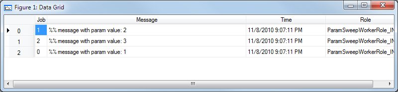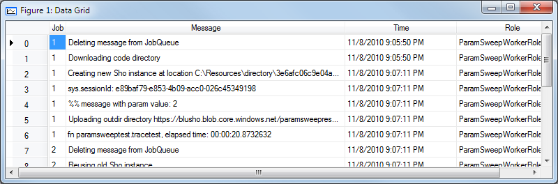 The results will be displayed in a Sho datagrid, with the results from each job grouped together. Note that there is a delay of a couple of minutes between when your work function calls tracemessage and when the corresponding log message is viewable. Passing in True as the optional second parameter to showLog will display internal trace messages that the service records, which can be useful when troubleshooting:
