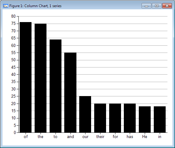 >>> txt = System.IO.File.ReadAllText("./declarationofindependence.txt")>>> table = System.Collections.Hashtable()>>> for word in txt.split(): if table.ContainsKey(word): table[word] += 1 else: table[word] = 1>>> pairs = zip(table.Keys, table.Values)>>> elts = sorted(pairs, lambda a, b: a[1] < b[1])[:10]>>> words, counts = zip(*elts)>>> bar(words, counts)