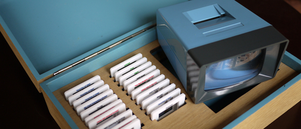 Content actually lives in the viewer. The small white slides correspond to sets of photos (opens in new tab) on Flickr (opens in new tab). When the slides are inserted in the device the colour of the labels on each slide is analyzed, and a corresponding set of images appear on the small screen embedded in the viewer.