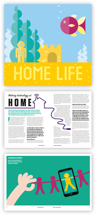 Issue 5 of our magazine is focused on the theme of Home Life. We are forever crafting our homes, forever making them feel our own in ways that instill our values and hopes. Computers, tablets, cell phones, game consoles, and other digital devices are increasingly playing a role in the way we do this. How should we make sense of technology in our homes and how might we approach designing new experiences for home life? In this issue we tease apart issues around the rhythm of home life, the need for subtle technologies for connecting us with others, looking at what it means to organize our home and create a space for playful interactions. We present a number of prototypes and ideas for thinking about the design of interactive technologies for home life.