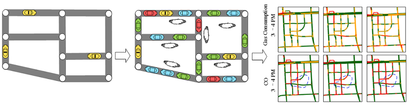 Methodology: We propose a Travel Speed Estimation (TSE) model based on a context-aware matrix factorization approach. TSE leverages features learned from other data sources, e.g., map data and historical trajectories, to deal with the data sparsity problem. We then propose a Traffic Volume Inference (TVI) model to infer the number of vehicles passing each road segment per minute. TVI is an unsupervised Bayesian Network that incorporates multiple factors, such as travel speed, weather conditions and geographical features of a road. Given the travel speed and traffic volume of a road segment, gas consumption and emissions are calculated based on existing environmental theories. Refer to publication [1] for details.