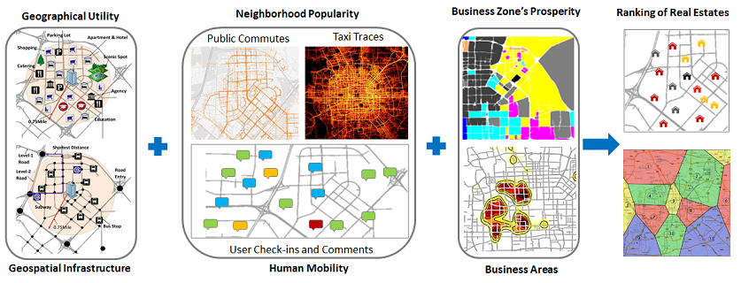 Abstract: Ranking residential real estate based on a diversity of big data around a real estate: 1) geographical data, such as road network and points of interests (POI), 2) human mobility data, like public commuting data and taxi traces, and 3) people’s comments and reviews on these real estates and their surrounding POIs in online services. These datasets reveal the popularity and quality of the location where a real estate is located.
