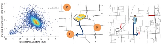 Abstract: We present a recommender for taxi drivers and people expecting to take a taxi, using the knowledge of 1) passengers’ mobility patterns and 2) taxi drivers’ pick-up behaviors learned from the GPS trajectories of taxicabs. First, this recommender provides taxi drivers with some locations (and the routes to these locations), towards which they are more likely to pick up passengers quickly (during the routes or at the parking places) and maximize the profit. Second, it recommends people with some locations (within a walking distance) where they can easily find vacant taxis. In our method, we propose a parking place detection algorithm and learn the above knowledge (represented by probabilities) from trajectories. Then, we feed the knowledge into a probabilistic model which estimates the profit of a parking place for a particular driver based on where and when the driver requests for the recommendation. We validate our recommender using trajectories generated by 12,000 taxis in 110 days.