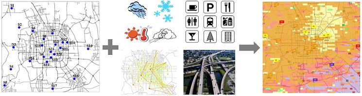 Goal: We infer the real-time and fine-grained air quality information throughout a city, based on the (historical and real-time) air quality data reported by existing monitor stations and a variety of data sources we observed in the city, such as meteorology, traffic flow, human mobility, structure of road networks, and point of interests (POIs).