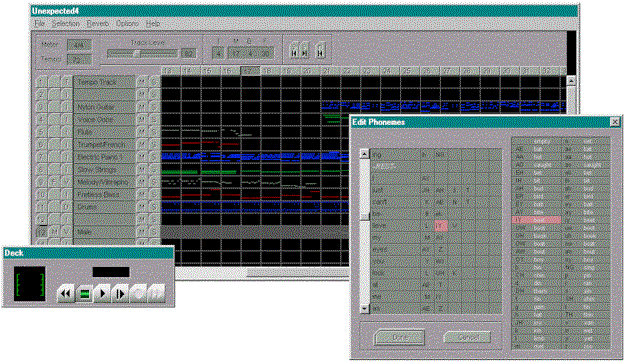 To demonstrate the potential of Microsoft’s Whistler speech technology for musical applications, a novel music synthesizer was designed. Running in real-time on Win32, the Whistler speech engine was combined with a software wavetable synthesizer. The wavetable synthesizer plays the instrumental accompaniment while Whistler sings the lyrics. The notes and lyrics are entered using a commercial MIDI editor then exported as a Standard MIDI File to the synthesizer for fine tuning and musical playback.