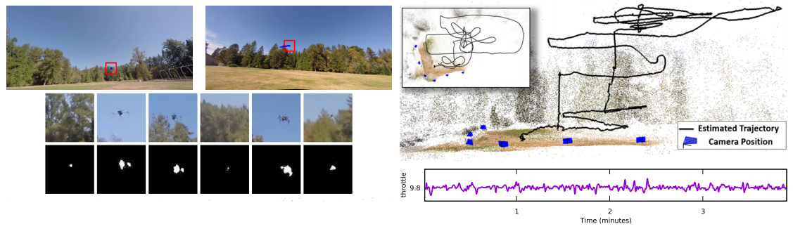 We propose a new method to estimate the 6-dof trajectory of a flying object such as a quadrotor UAV within a 3D airspace monitored using multiple fixed ground cameras. It is based on a new structure from motion formulation for the 3D reconstruction of a single moving point with known motion dynamics. Our main contribution is a new bundle adjustment procedure which in addition to optimizing the camera poses, regularizes the point trajectory using a prior based on motion dynamics (or specifically flight dynamics). Furthermore, we can infer the underlying control input sent to the UAV’s autopilot that determined its flight trajectory. Our method requires neither perfect single-view tracking nor appearance matching across views. For robustness, we allow the tracker to generate multiple detections per frame in each video. The true detections and the data association across videos is estimated using robust multi-view triangulation and subsequently refined during our bundle adjustment procedure. Quantitative evaluation on simulated data and experiments on real videos from indoor and outdoor scenes demonstrates the effectiveness of our method.