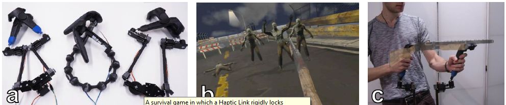 (a) Three prototype Haptic Links attached to commercial HTC Vive controllers. (b-c) A survival game in which a Haptic Link rigidly locks handheld controllers in the shape of a two-handed gun. Overlay added in post-production for visualization.