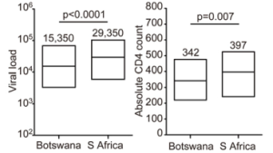 Here’s a provocative thought: as we roll out drugs to the sickest people first, are we selecting for weaker viruses–ie, those that don’t make people sick, and thus are less likely to be subjected to drug therapy? We don’t have direct evidence for this, but when we compare Botswana to South Africa, we see high CD4 (healthier immune systems) per level of viral load (viral concentration) or viral replicative capacity (how well it grows in a lab). Perhaps related (perhaps not), we also see an increased burden of circulating HLA escape mutations. At the very least, this increased burden appears to have wiped out B*57’s ability to modulate relative viral control. Might it also have weakened the virus?