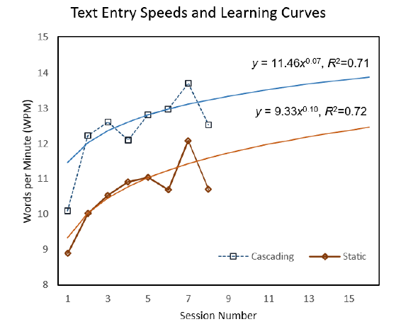 We present cascading dwell gaze typing, a novel approach to dwell-based eye typing that dynamically adjusts the dwell time of keys in an on-screen keyboard based on the likelihood that a key will be selected next, and the location of the key on the keyboard. Our approach makes unlikely keys more difficult to select and likely keys easier to select by increasing and decreasing their required dwell times, respectively. To maintain a smooth typing rhythm for the user, we cascade the dwell time of likely keys, slowly decreasing the minimum allowable dwell time as a user enters text. Cascading the dwell time affords users the benefits of faster dwell times while causing little disruption to users’ typing cadence. Results from a longitudinal study with 17 non-disabled participants show that our dynamic cascading dwell technique was significantly faster than a static dwell approach. Participants were able to achieve typing speeds of 12.39 WPM on average with our cascading technique, whereas participants were able to achieve typing speeds of 10.62 WPM on average with a static dwell time approach. In a small evaluation conducted with five people with ALS, participants achieved average typing speeds of 9.51 WPM with our cascading dwell approach. These results show that our dynamic cascading dwell technique has the potential to improve gaze typing for users with and without disabilities.