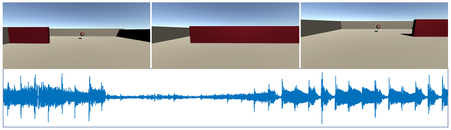 Our system performs live 2D wave simulation at interactive rates to capture variation in acoustic effects from arbitrary dynamic changes in scene geometry. In the above scene, the moving wall shown in red moves from left to right, obstructing the source in the center of the image. Our system renders the smooth variation in loudness, as seen in the waveform at bottom.
