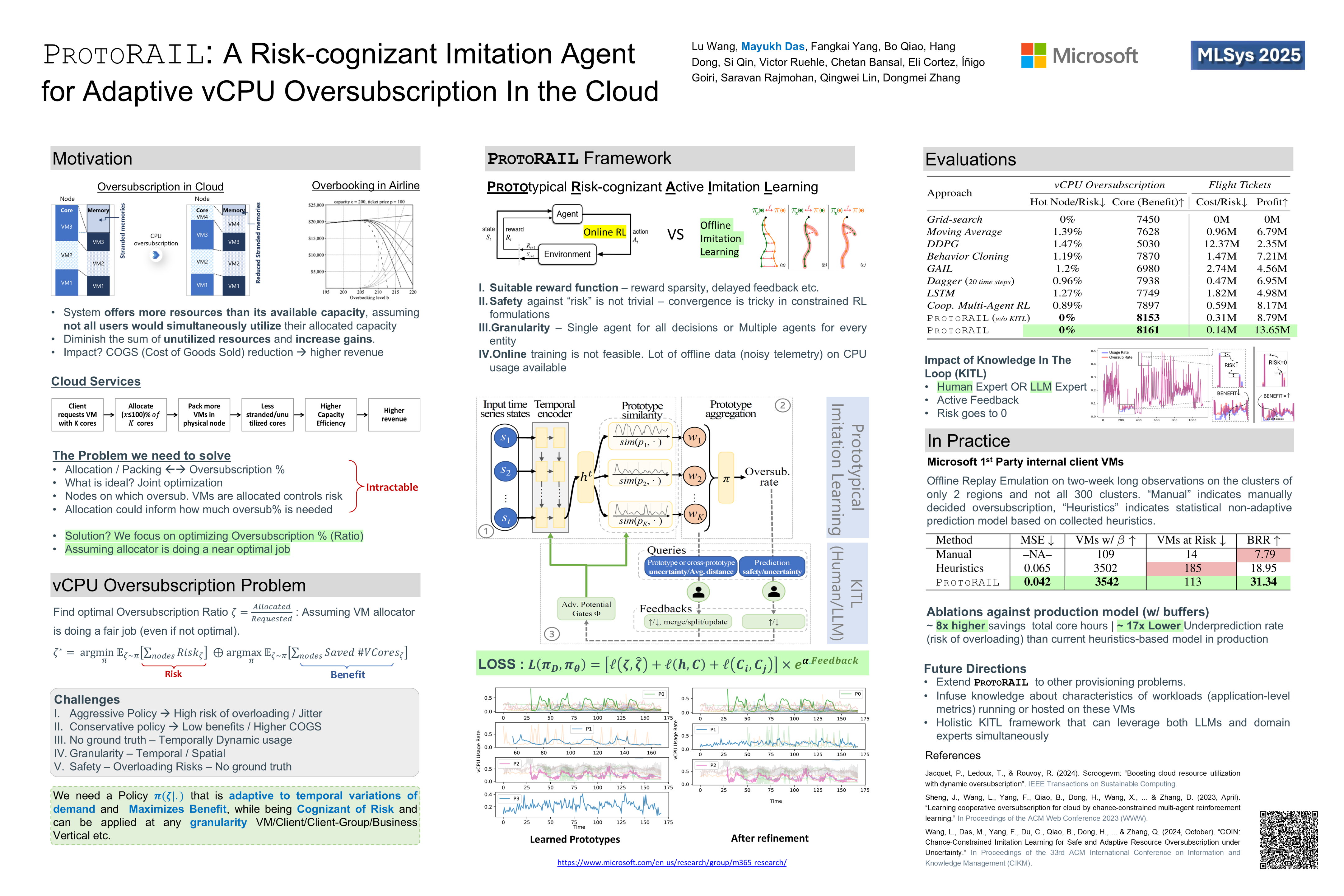 Most oversubscription policies today are engineered either with tribal knowledge or with static heuristics about the system, which lead to catastrophic overloading or stranded/under-utilized resources. Smart oversubscription policies that can adapt to demand/utilization patterns across time and granularity to jointly optimize cost benefits and risks is a non-trivial, largely, unsolved problem. We address this challenge with our proposed novel Prototypical Risk-cognizant Active Imitation Learning (ProtoRAIL) framework that exploits approximate symmetries in utilization patterns to learn suitable policies. The active knowledge-in-the-loop (KITL) module de-risks the learned policies. Our empirical investigations and real deployments on X company’s internal (1st party) cloud service, show orders of magnitude reduction (≈≥ 90×) in risk and significant increase in benefits (saved stranded resources: in a range of ≈ 7 to 10%).