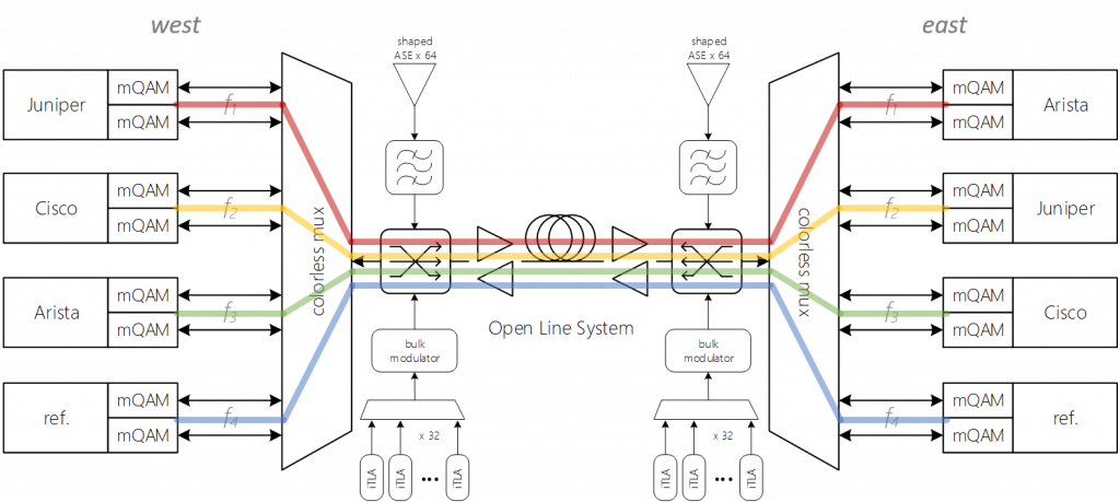 Optical line-side interoperability is a critical component for enabling cloud service providers to deploy capacity at scale with a diverse supply chain. Historically, vendor-locked line systems and proprietary coherent digital signal processing (DSP) technologies have been barriers to this goal. Advances in open line platforms and coherent interfaces embedded directly in layer-2/3 switches and routers have begun paving the way toward full end-toend interoperation. In this paper, we take a partial step toward demonstrating end-to-end interop by interoperating vendor-diverse packet switching platforms from Arista, Cisco, and Juniper, which utilize the same coherent DSP chip set, over an open line system (OLS). All three vendors’switches feature integrated coherent optics and are shown to interoperate over 2000 km at 150G 8QAM and 1000 km at 200G 16QAM on Microsoft’s OLS.
