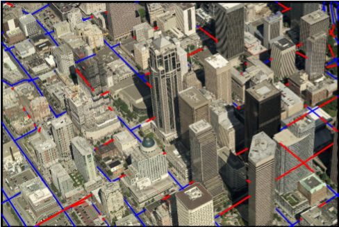 Oblique images are aerial photographs taken at oblique angles to the earth’s surface. Projections of vector and other geospatial data in these images depend on camera parameters, positions of the entities, surface terrain, and visibility. This paper presents a robust and scalable algorithm to detect inconsistencies in vector data using oblique images. The algorithm uses image descriptors to encode the local appearance of a geospatial entity in images. These image descriptors combine color, pixel-intensity gradients, texture, and steerable filter responses. A Support Vector Machine classifier is trained to detect image descriptors that are not consistent with underlying vector data, digital elevation maps, building models, and camera parameters. In this paper, we train the classifier on visible road segments and non-road data. Thereafter, the trained classifier detects inconsistencies in vectors, which include both occluded and misaligned road segments. The consistent road segments validate our vector, DEM, and 3-D model data for those areas while inconsistent segments point out errors. We further show that a search for descriptors that are consistent with visible road segments in the neighborhood of a misaligned road yields the desired road alignment that is consistent with pixels in the image.
