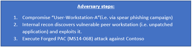 With the above diagram, an incident response team sees that Windows Defender ATP detected a user level exploit (assuming the application ran in user mode) and raised the first alert for this attack. When the attacker attempts to access the domain controller using a forged Privilege Attribute Certificate (PAC), the attack fails because you have patched your domain controllers for MS14-068. Advanced Threat Analytics detects the failed forged PAC attempt, which is a sign the adversary is active in your environment and attempting to escalate privileges.