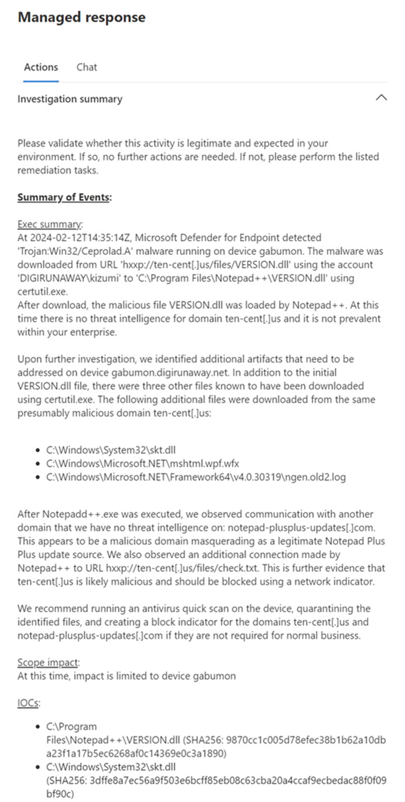 With complex cyberattacks, security operations teams need robust guidance on what is happening and how to prioritize remediation efforts. Throughout this evaluation, we provided over 18 incidents, 196 alerts, and enriched product detections with human-driven guidance via email and in product experiences using Managed responses. This includes a detailed investigation summary, indicators of compromise (IOCs), advanced hunting queries (AHQs), and prioritized remediation actions to help contain the cyberthreat. Our world class hunting team focuses on providing initial response to a cyberattack, then iterations on updates based on new threat intelligence findings and other enrichment.