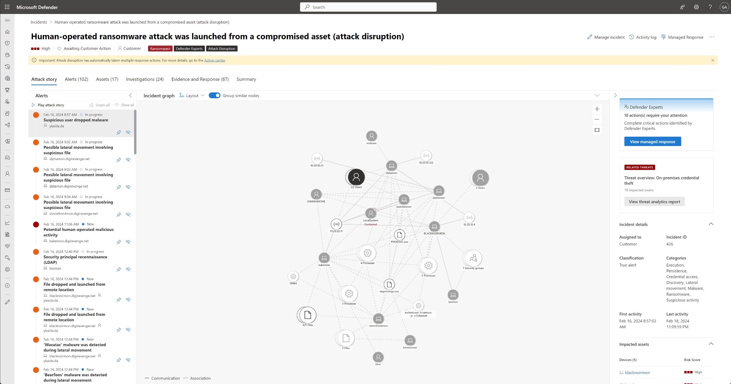 Figure 4. A summary attack graph, managed responses and attack disruption automatically handling this ransomware threat.