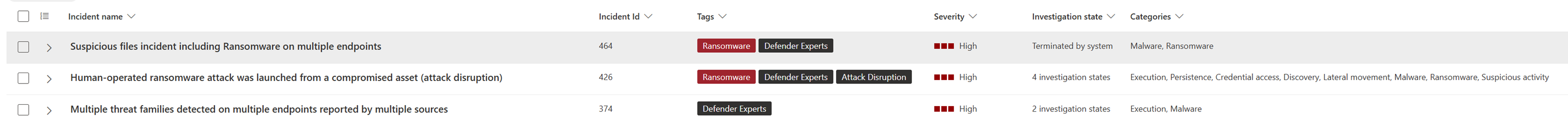 Summary of all incidents and Defender Experts tag to help filter and prioritize for customers.